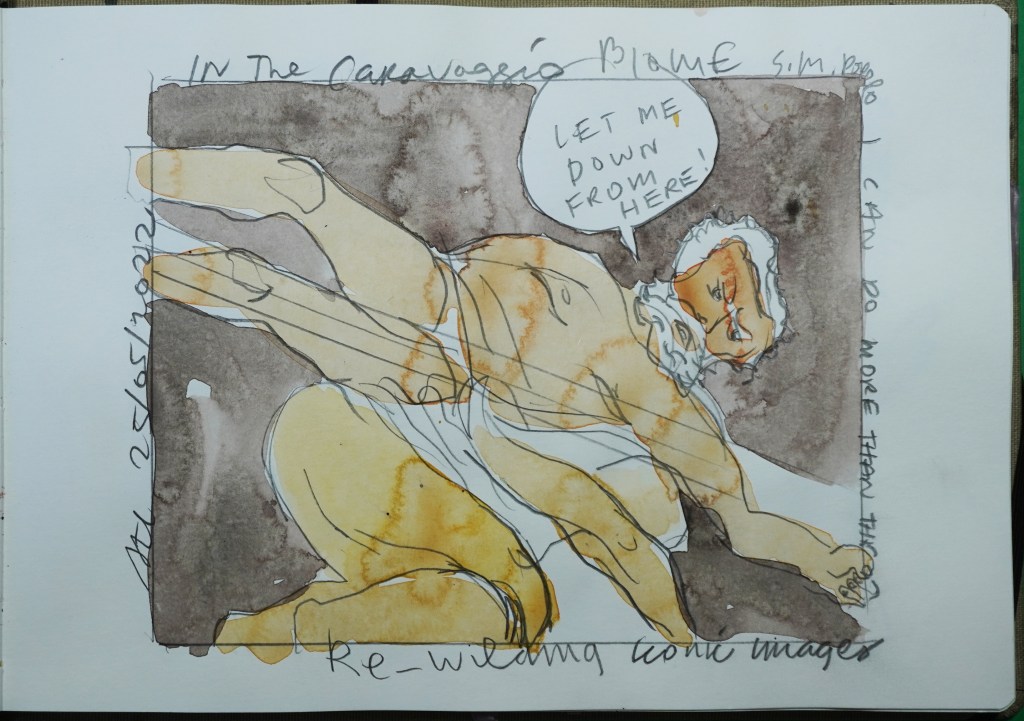 The Brute Resistance Series. “Re-wilding iconic images.” “Let me down from here!” – “I can do more than this.” Drawing after Caravaggio. PtL.