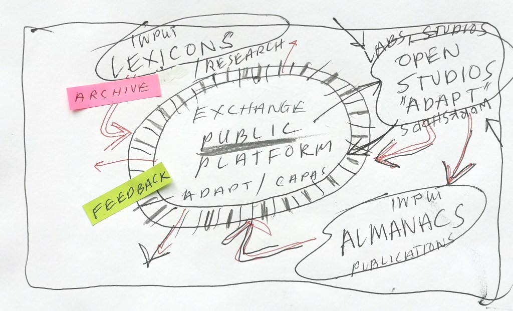Diagram: program for a project that connects the making of lexicons and almanacs with a public exchange platform. 2023. PtL.